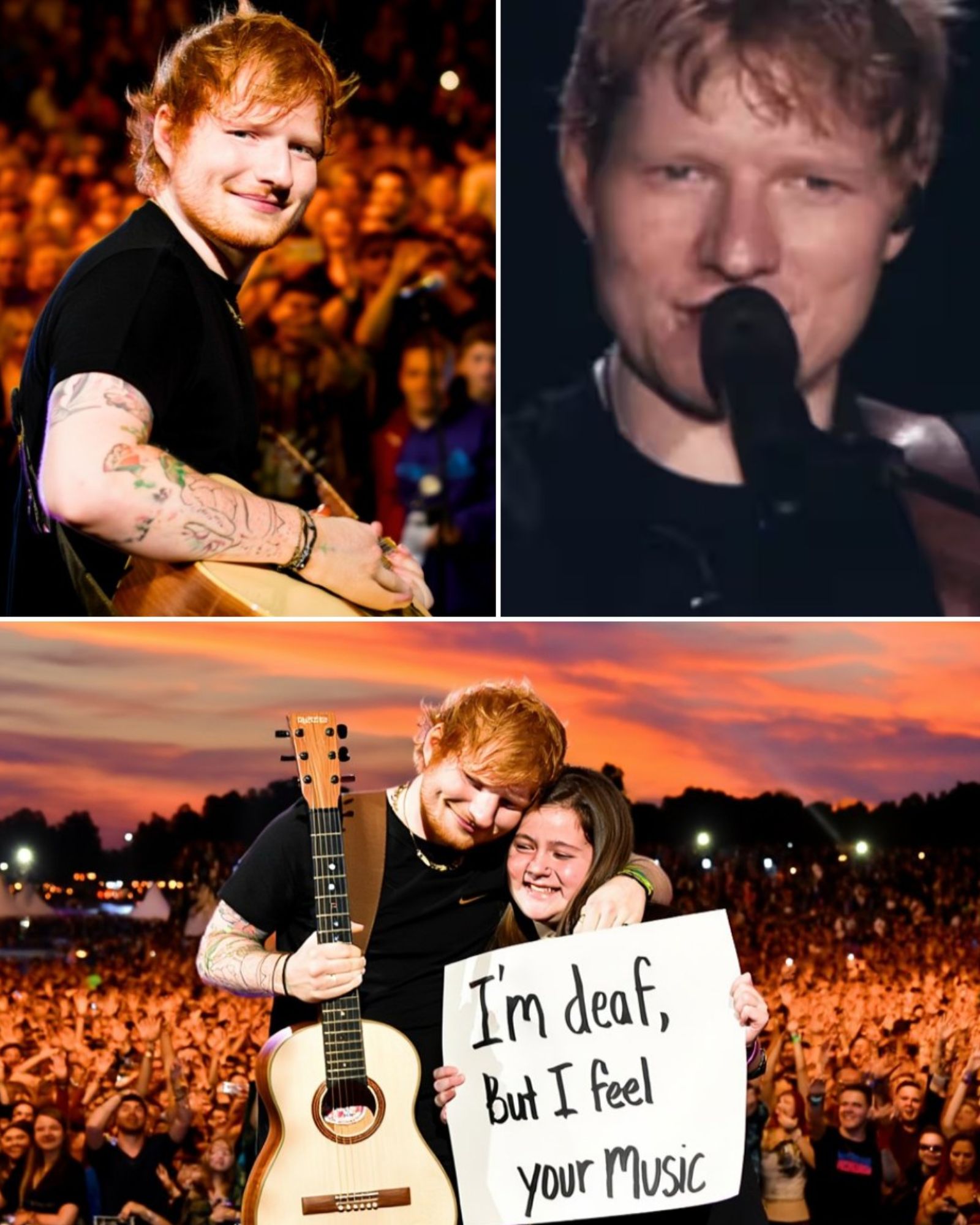 There are concerts people attend… and then there are nights that stay with an entire city. Ed Sheeran’s Amsterdam show became the latter the moment he noticed a small, trembling sign in the crowd. It read, “I’m deaf, but I feel your music.” Simple words. Shaky handwriting. But enough to make Ed stop mid-stride as if the whole arena had taken one breath and held it.