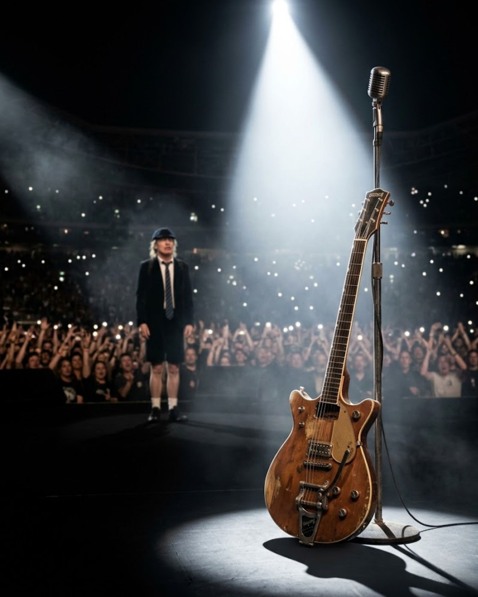 The massive crowd roared, expecting Angus to strap it on, to perhaps play a soaring tribute riff on his brother’s famous instrument. But Angus didn’t put it on. He knew he couldn’t. Instead, with a quiet reverence that stood in stark, beautiful contrast to the arena’s chaotic energy, he walked over to Malcolm’s old microphone stand. Gently, carefully, Angus leaned the battered Gretsch against the stand.\