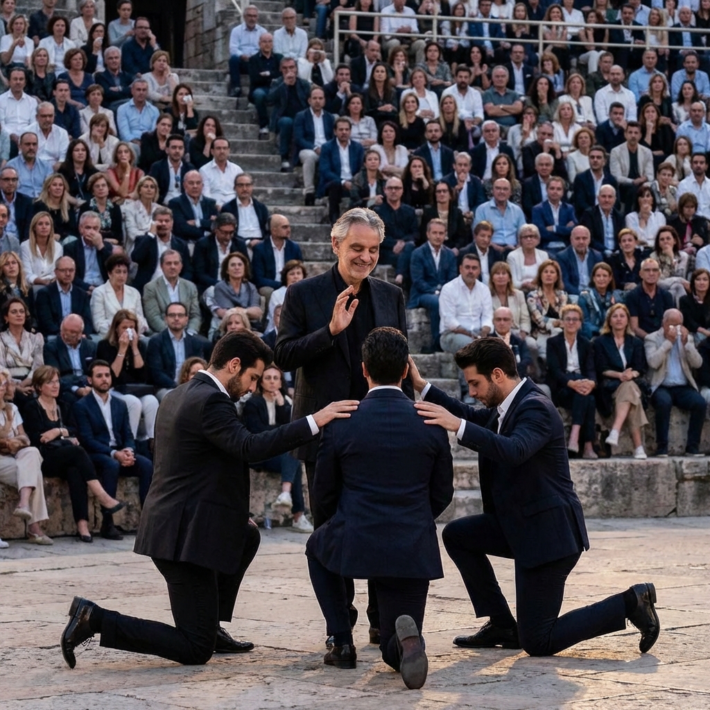 The difference was immediate. The audience noticed it before the first note. The three young men of Il Volo—Piero Barone, Ignazio Boschetto, and Gianluca Ginoble—were not positioned beside Andrea Bocelli the way fans were used to seeing them. Instead, Il Volo moved closer, then lower, kneeling on one knee. One by one, Piero Barone, Ignazio Boschetto, and Gianluca Ginoble placed a hand on Andrea Bocelli’s shoulder. Not for drama. Not for a camera. It looked like instinct: three students turning themselves into a steady ring around the teacher who had changed their lives.