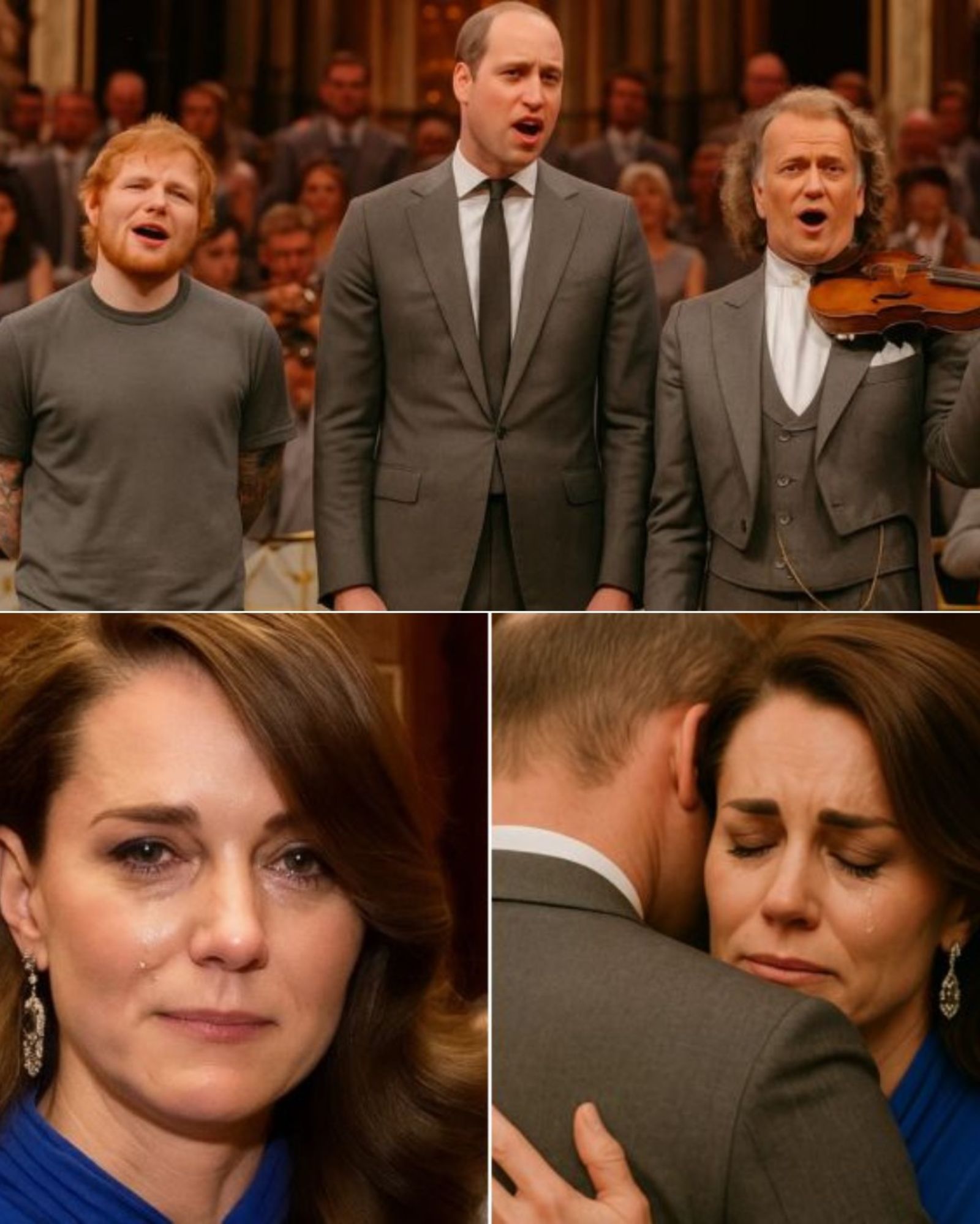 This wasn’t a performance. It was a vow — a living promise spoken through music. As William’s voice cracked near the end, he never broke eye contact with Kate. The hall seemed to dissolve around them. When the final note faded, he stepped forward, knelt at the edge of the stage, and took her hand. The room erupted into sobs and cheers. André Rieu, visibly moved, wiped his eyes. Ed Sheeran stepped back, smiling softly — knowing history had just been made.