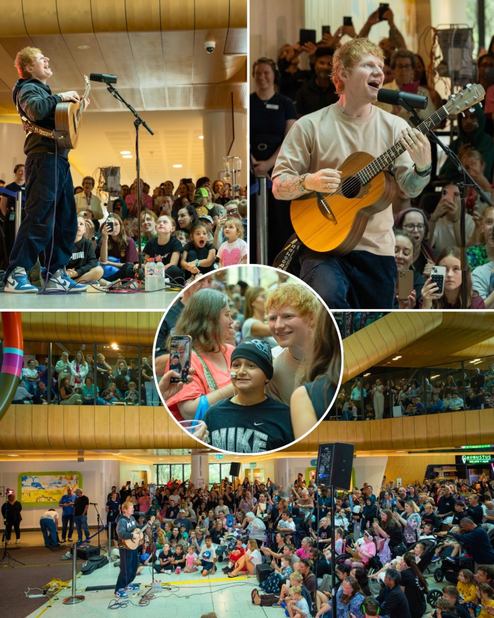 For those inside the hospital, the performance came as a complete surprise. As word spread through the building that Ed Sheeran had arrived, patients, families, and hospital staff gathered in the foyer to witness the special moment.