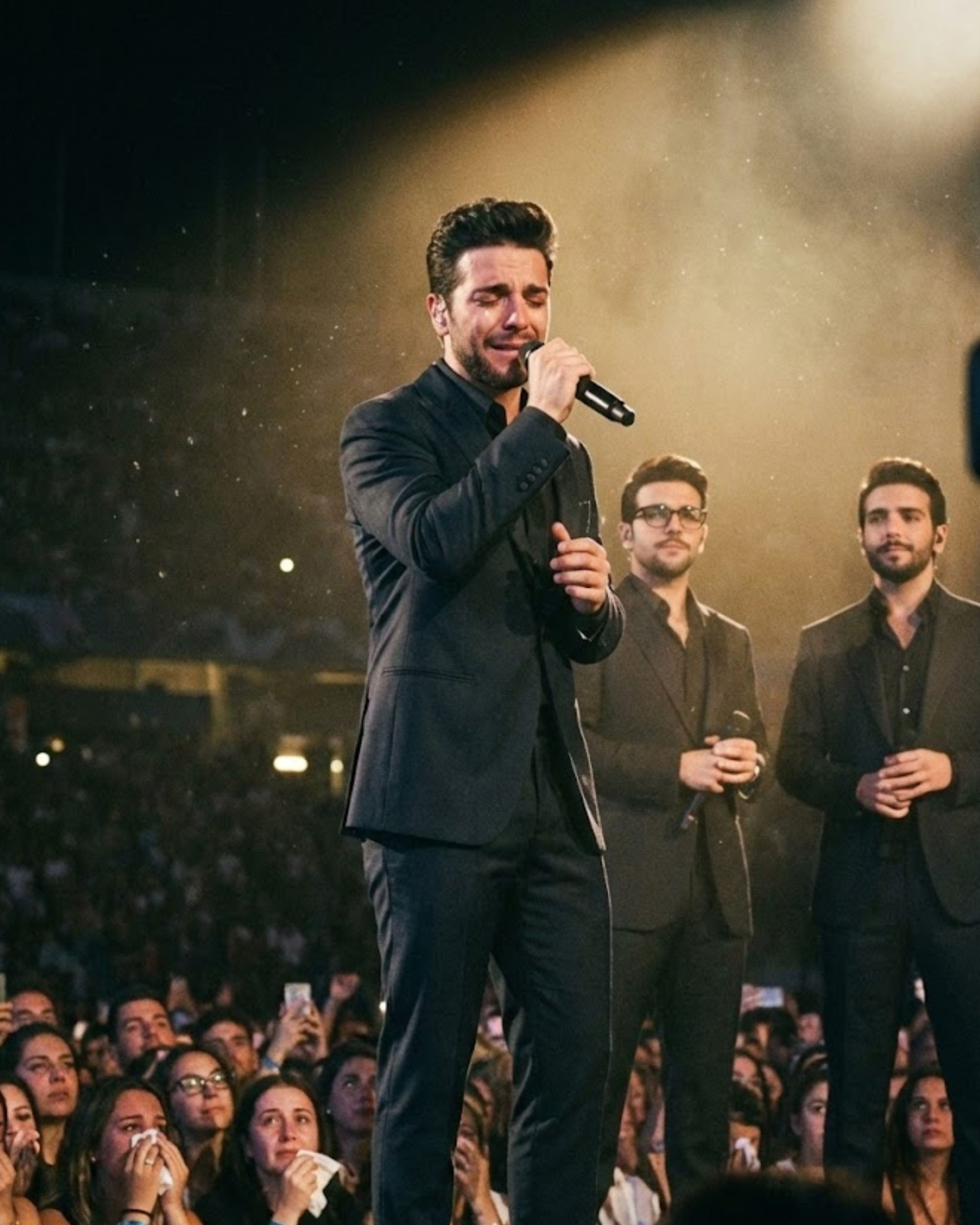 In that instant, the polished image disappears. There is no performer anymore—only a man standing inside the emotion of the song. The pain, the love, the longing that Lucio Dalla once wrote into those words seems to pass straight through him and into the crowd.