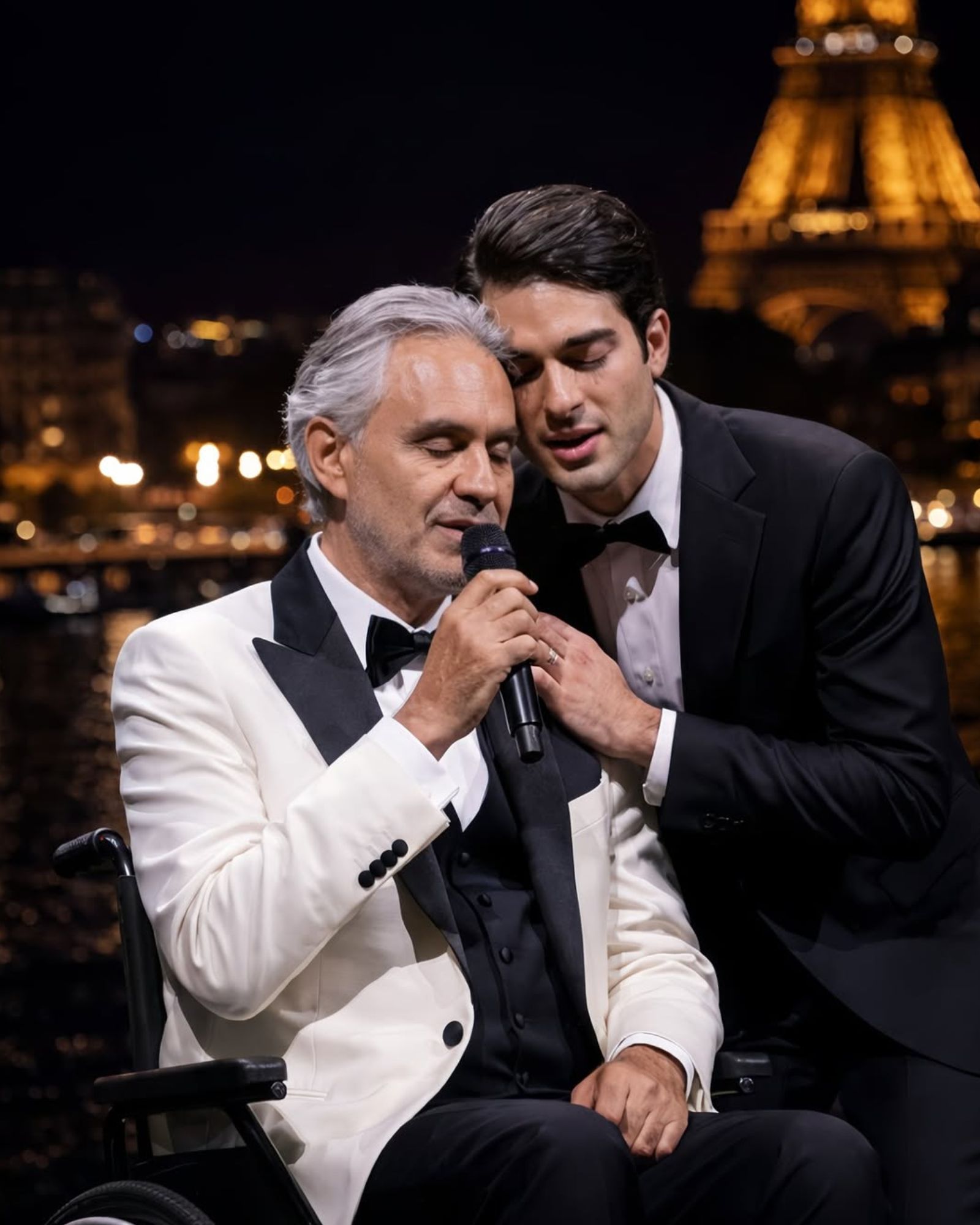 From the side of the stage, Matteo Bocelli walked toward his father. No announcement followed him. No dramatic pause. He simply took his place beside Andrea, close enough that their shoulders almost touched.