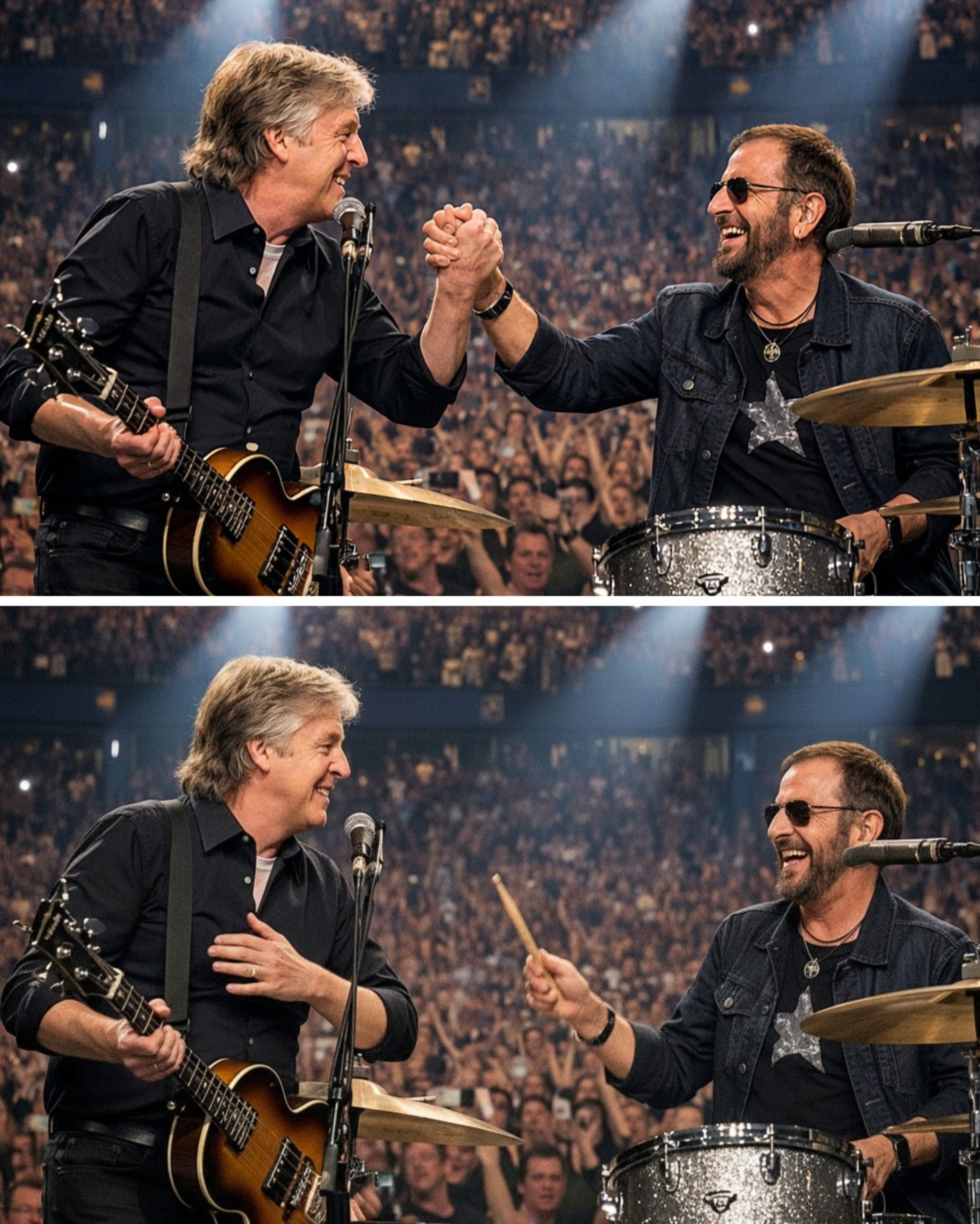 From the side of the stage, Ringo Starr emerged behind a full drum kit, beaming with that familiar, infectious smile. In that instant, the last two living Beatles stood reunited, not in memory or tribute — but in rhythm and reality. Phones trembled. Tears flowed. And thousands witnessed what they never dreamed they’d see again.