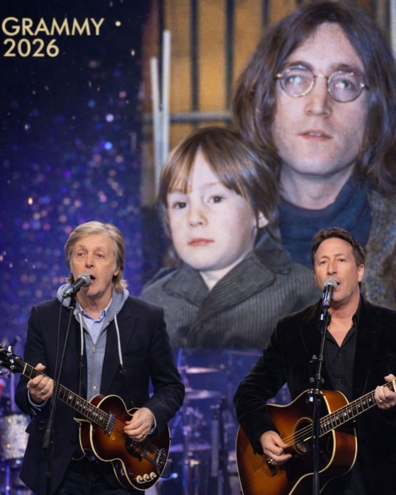 On the Grammy stage in 2026, Paul McCartney stepped forward, not as an icon revisiting the past, but as a voice carrying something unfinished. He did not stand alone. Beside him was Julian Lennon, calm and composed, his presence immediately changing the weight of the moment.