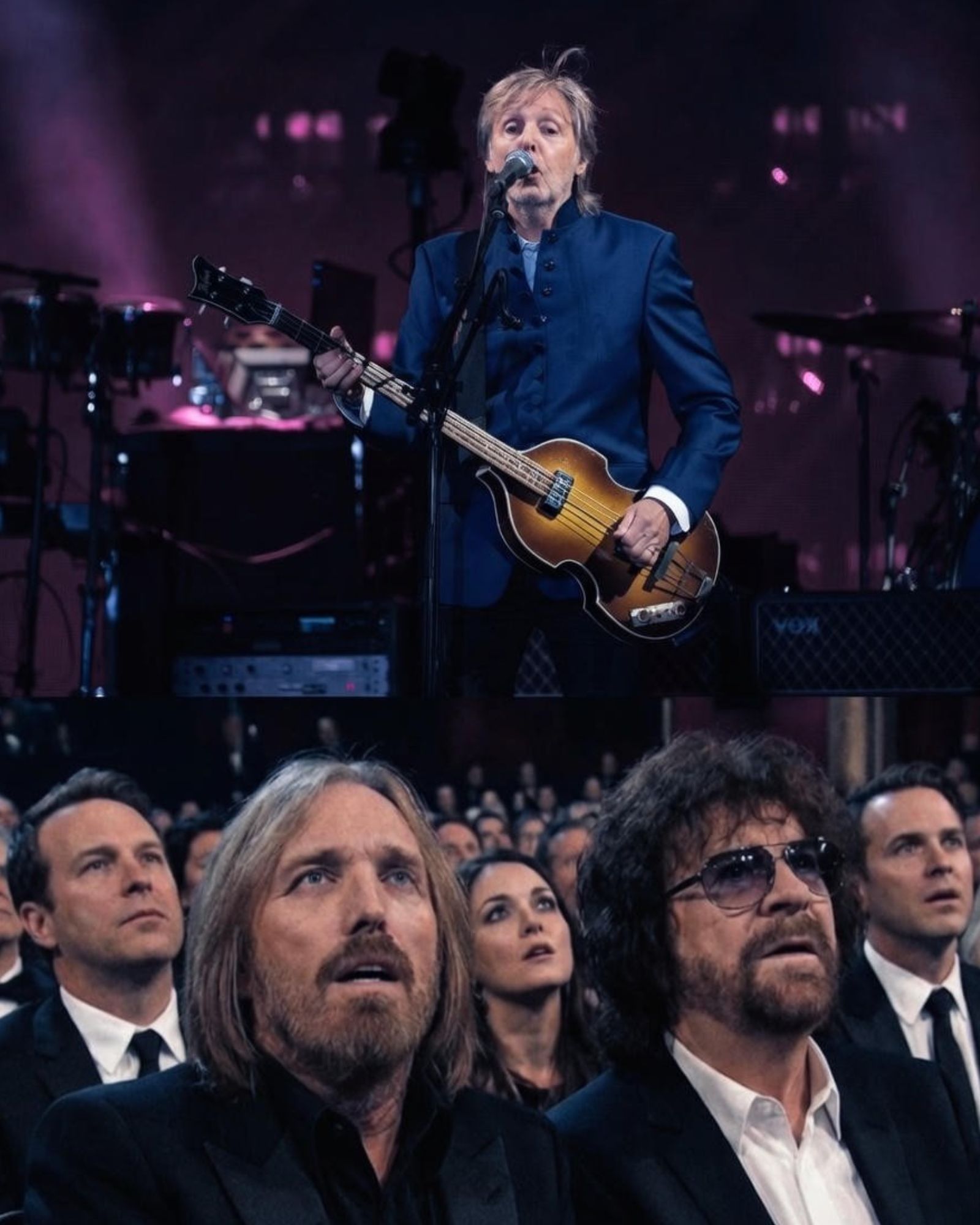As they reached the line “I look at the world and I notice it’s weeping,” the moment landed differently. Petty’s voice carried the ache. Lynne’s tone kept it steady. And Paul’s harmonies—so familiar, so unmistakable—felt like George’s shadow standing just offstage.