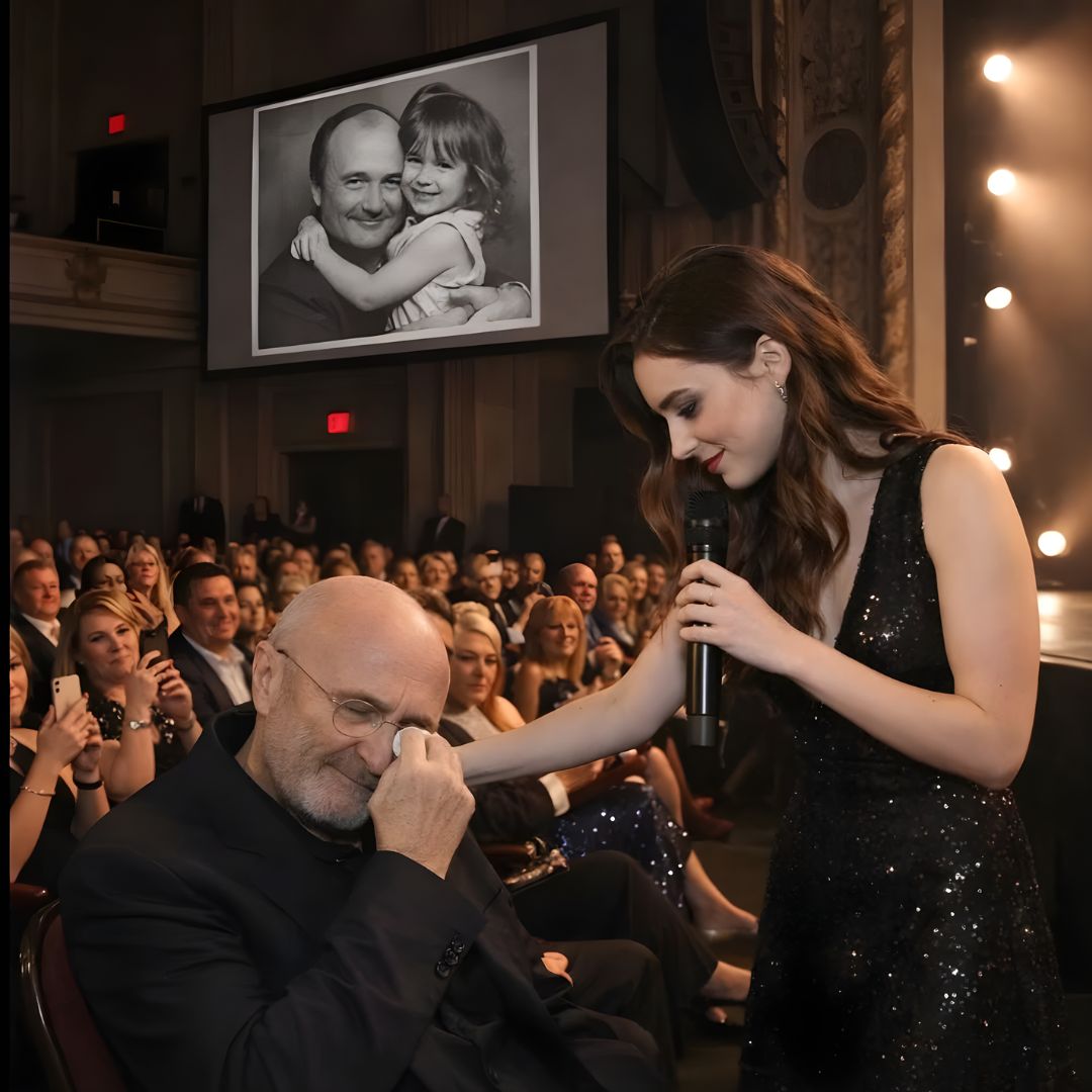 The evening was intended to be a celebration of music and heritage, but the atmosphere shifted the moment Lily Collins stepped onto the stage. Known primarily for her celebrated acting career, Lily Collins has always navigated the shadow of her father’s immense legacy with grace and independence. But on this night, she didn’t stand there as a Hollywood star. She stood there as a daughter with something deeply personal to say. As she approached the microphone, the room fell into a heavy, expectant silence. In the front rows, Phil Collins sat quietly, his eyes fixed on the stage, watching the girl he had raised prepare to speak to his soul.